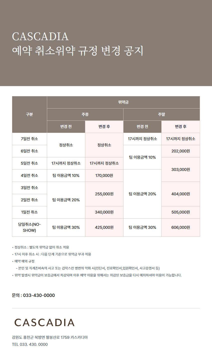 제목CASCADIA 예약 취소위약 규정 변경 공지 2026-01-20